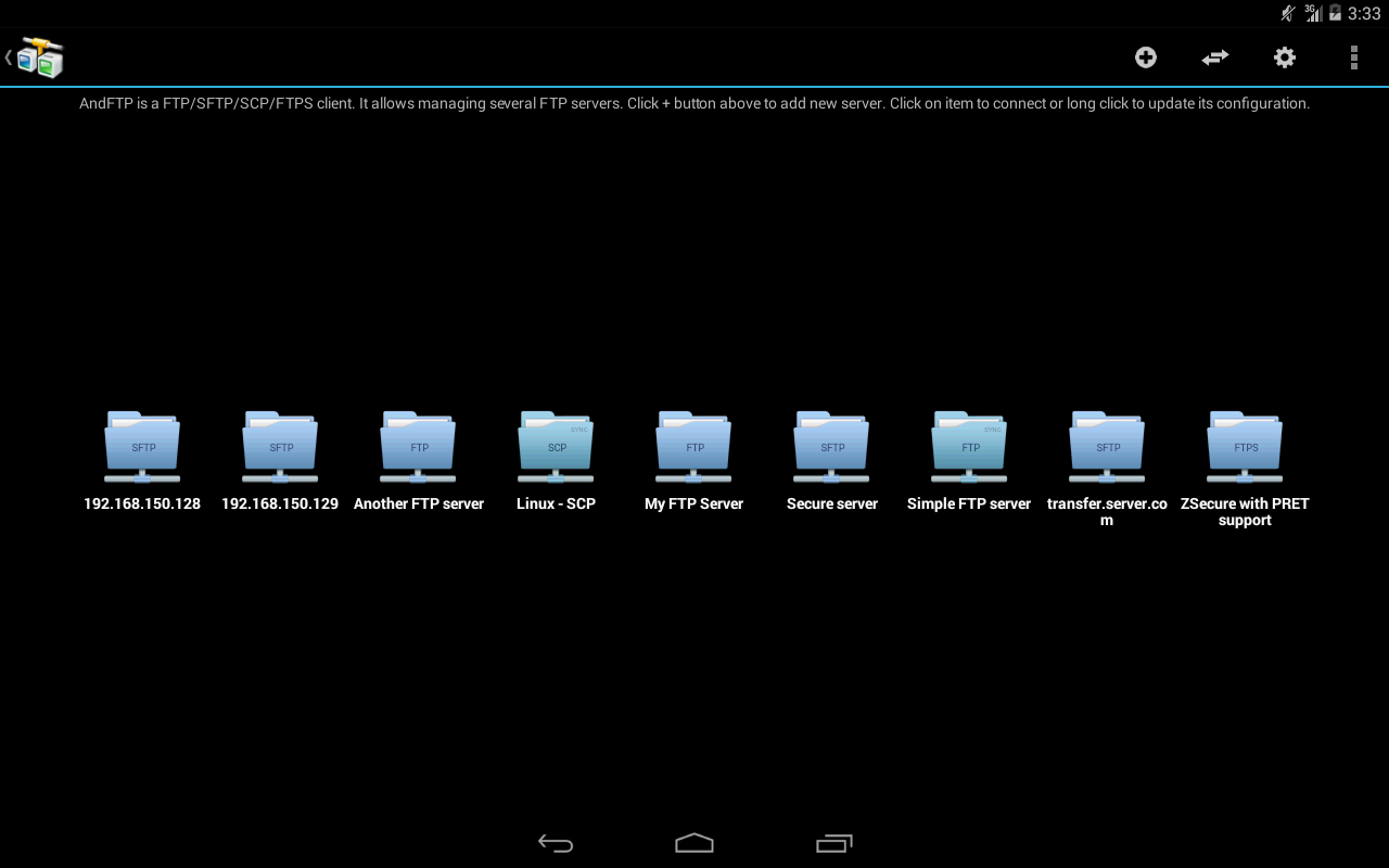 AndFTP — полнофункциональный FTP-клиент для Android-смартфонов. Поддерживаются соединения по протоколам FTP, SFTP и FTPS, загрузка файлов с/на сервер, а также все основные функции FTP-клиента.