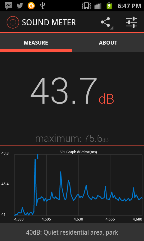 SPL (Уровень звукового давления) метр использует ваш телефон микрофон для измерения шума громкости в децибелах (дБ) и показывает график для вас, чтобы визуализировать измерения.Обратите внимание, что мобильный телефон микрофоны были приведены в соответствие с человеческим голосом при 300-3400 Гц (40-60дБ).