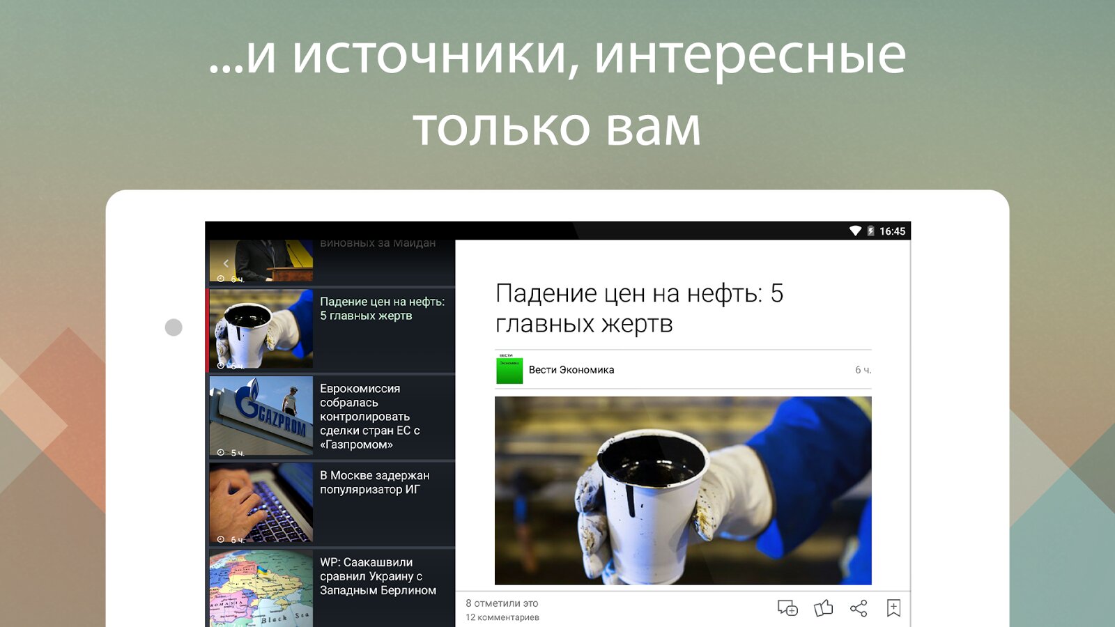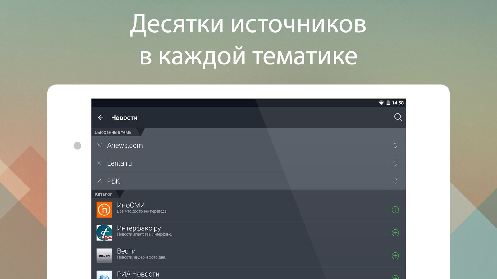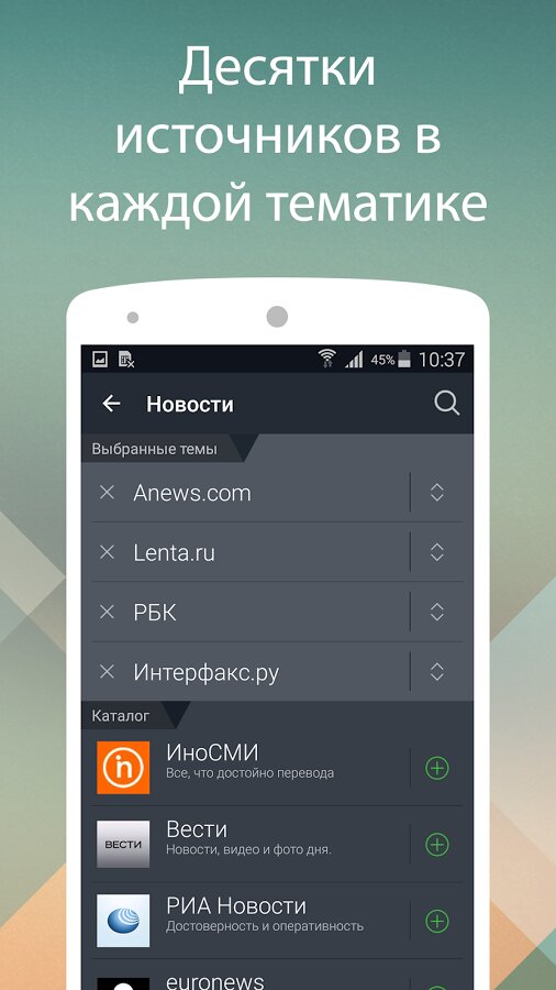 Больше не нужно открывать новостные сайты, блоги и соцсети по отдельности – выбирайте интересные темы, любимые источники и легко читайте всё и сразу.