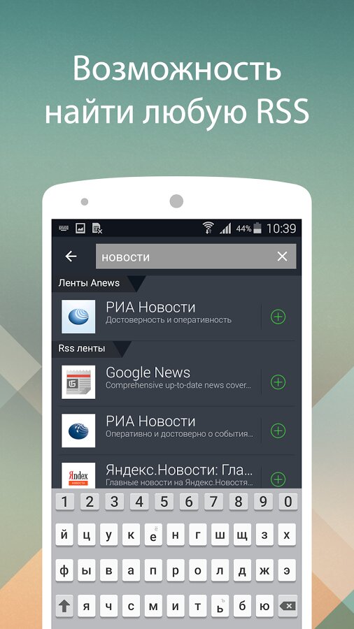 - Удобный поиск для добавления новых источников.