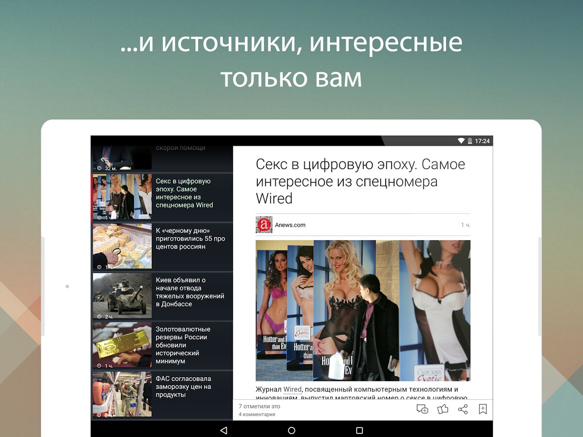 Anews — все ведущие русскоязычные СМИ, блоги и социальные сети в одном приложении. Бесплатный новостной агрегатор Anews позволяет отслеживать все интересующие вас темы и источники через единый удобный интерфейс. Нужная статья открывается одним прикосновением, навигация предельно проста, а редакторы всегда предложат свежую подборку самых интересных материалов.