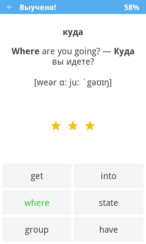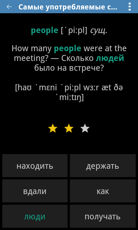 Всё обучение построено на тестах, в ходе которых пользователь получает золотые звездочки. При наборе 3-х звездочек элемент словаря считается выученным. При этом английские слова и фразы произносятся встроенным синтезатором речи (управляется с помощью системных настроек Вашего Android). Также предусмотрен вывод транскрипции 3-х видов: британской, американской и русской.
