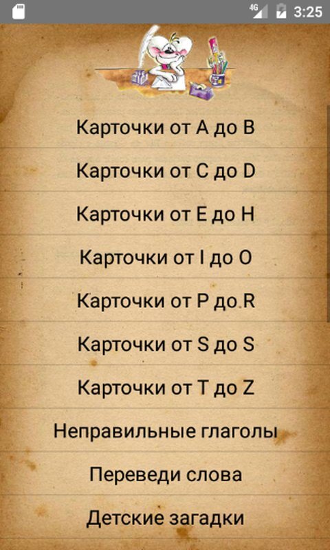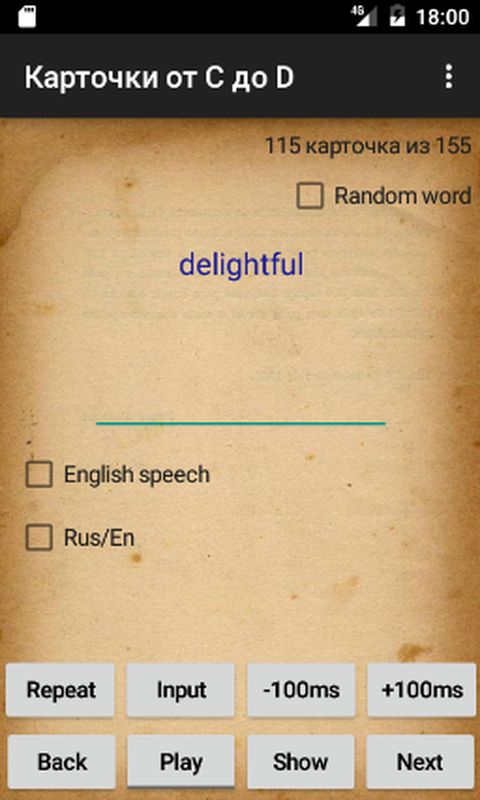 Программа сначала показывает английское слово, потом перевод (или наоборот). В программе свыше 2000 английских слов и 198 неправильных глаголов.