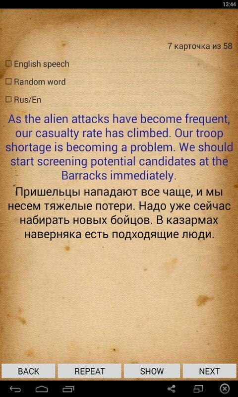 Это электронный англо-русский разговорник. Чтобы быстро выучить слова на английском языке — тренируйте память, по принципу вопрос-ответ.