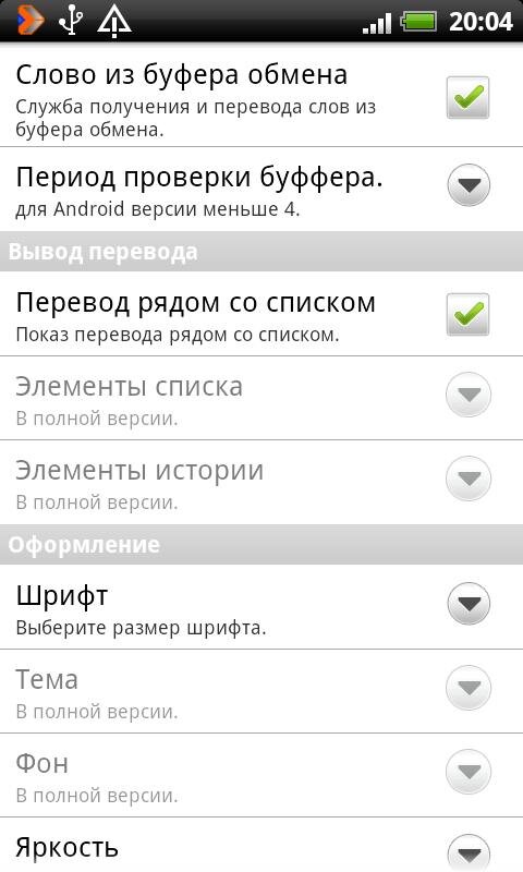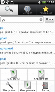 - Озвучка слов (в русско-англ версии) — долгий тап на элементе списка; для качественного произношения рекомендую поставить SVOX (чтобы работал: поставьте в настройках андроида SVOX по-умолчанию) (в версии 2.2 Pro)