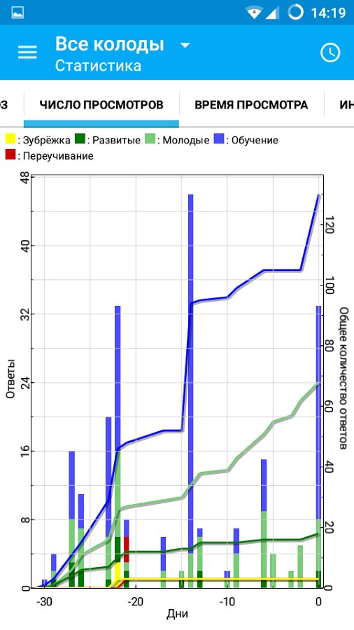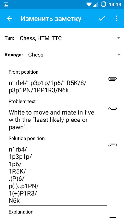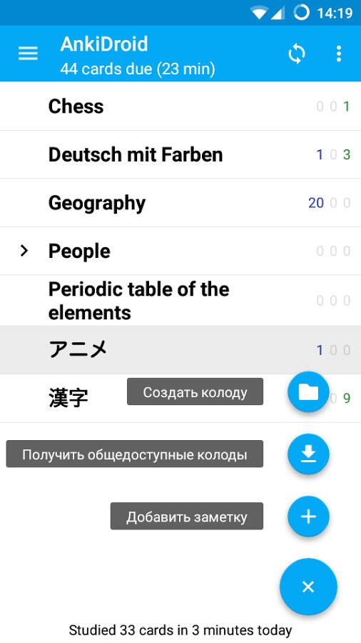 AnkiDroid - предлагает эффективный способ заучивания информации, показывая учебные карточки до того, как вы их забудете. Она полностью совместима с программой интервальных повторений Anki (включая синхронизацию), которая доступна для Windows, Linux и MacOS. Каждый «факт» является набором объектов — слов, определений, произношений и т. п., из которых по указанным в базе шаблонам автоматически создаются карточки. Объекты могут состоять из текста со стилями, изображений, звуков. Колоды (наборы карт) для заучивания могут быть созданы вручную, экспортированы из других аналогичных программ или загружены из списка «совместных колод» (т.е. созданных и расшаренных другими пользователями).