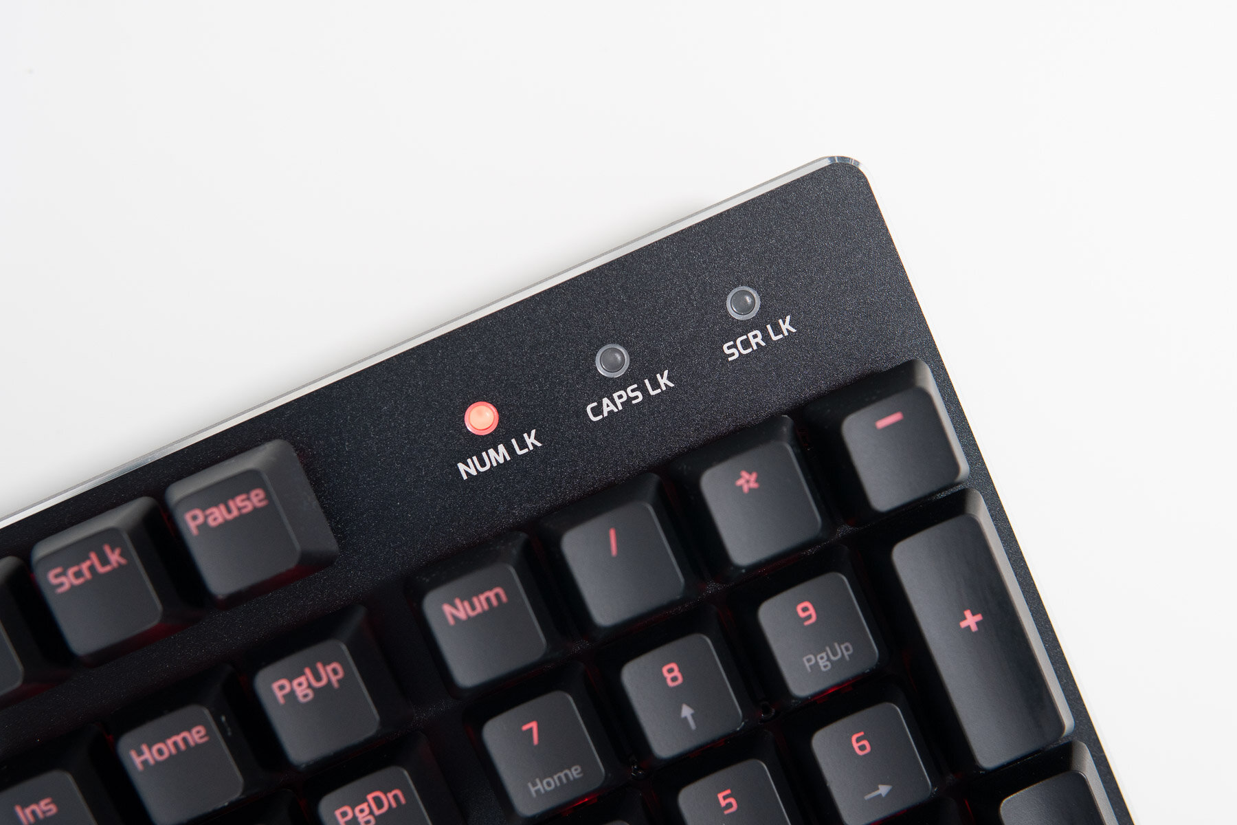 Каждая клавиша подсвечивается собственным светодиодом. В тёмное время у основания колпачков заметен красивый ореол, заполняющий светом пространство между клавишами.