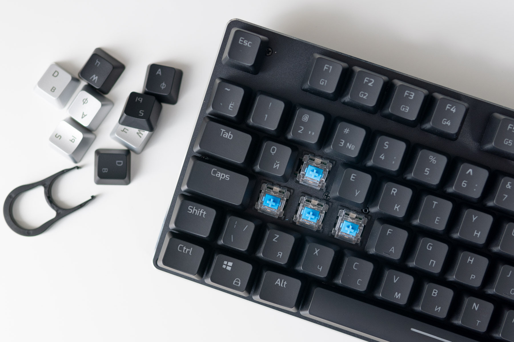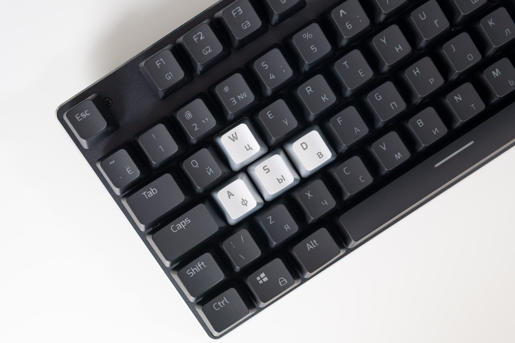 По умолчанию установлены пластиковые колпачки с приятным слегка шершавым покрытием. В комплекте лежат сменные кейкапы для клавиш WASD, отличающиеся гладким покрытием.