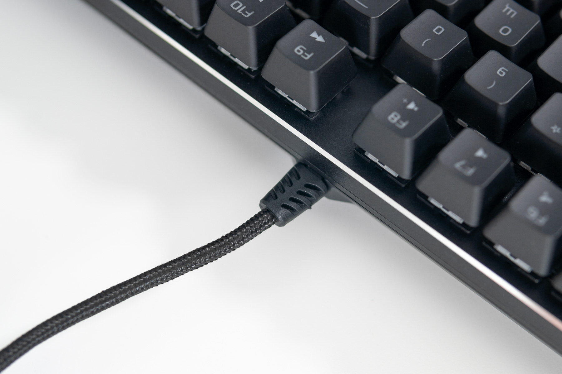 Провод спрятан в тканевую оплётку и с обеих сторон защищен от перегиба. Ближе к штекеру закреплён ферритовый фильтр, штекер позолоченный. Многоразового хомута нет, но для клавиатуры он и не требуется.