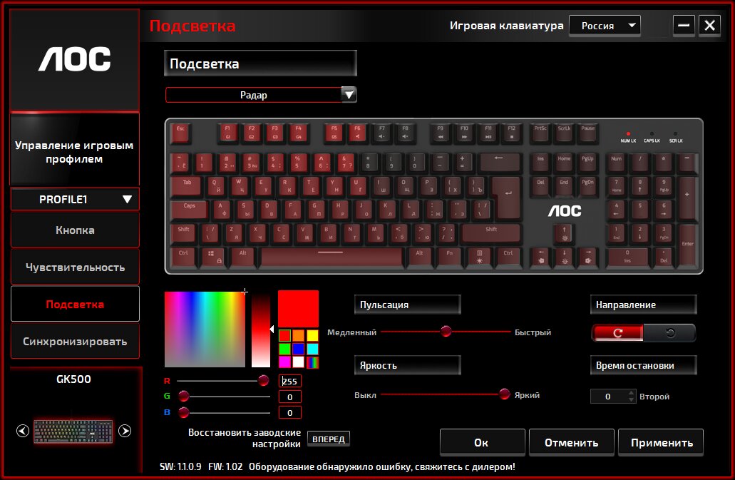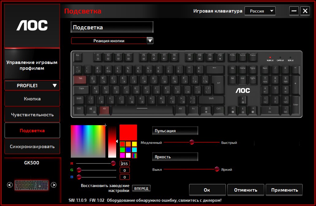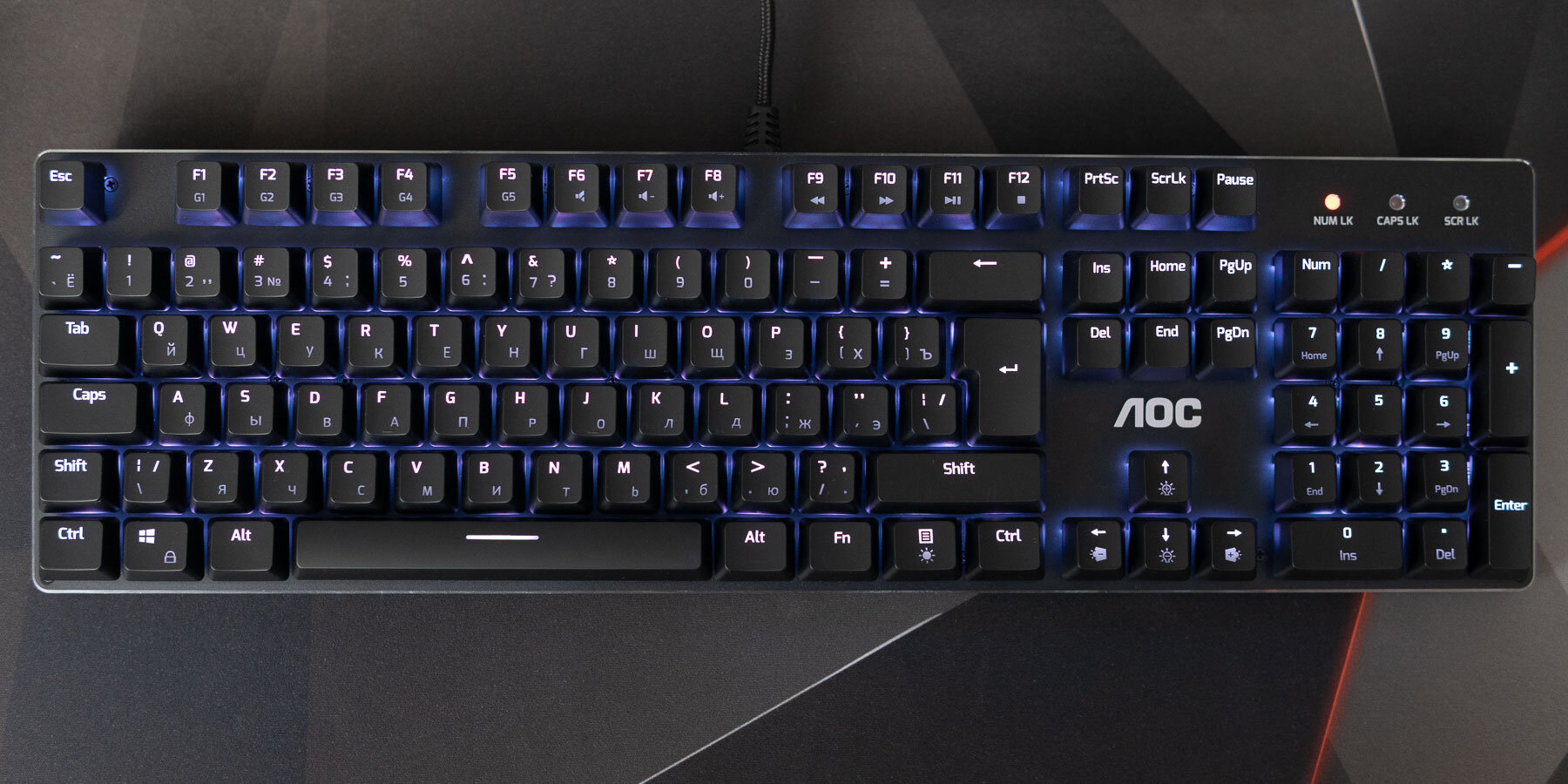У AOC GK500 три уровня яркости подсветки. Как и у других Cherry-подобных переключателей, светодиод находится в верхней части. Как результат, латинские и кириллические символы просвечиваются с разной интенсивностью, делая свечение недостаточно равномерным. Приложенная фотография сделана в хорошо освещенной комнате, в темное время суток разница практически незаметна. Это распространённая особенность механических клавиатур.