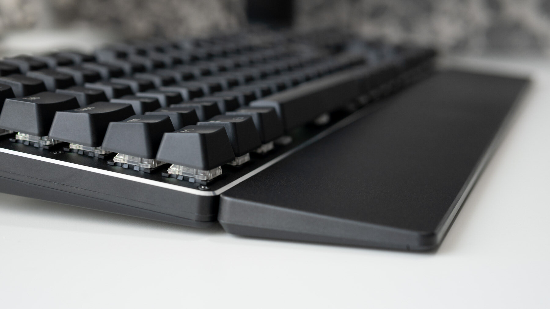 В комплект поставки входит просторный упор для ладоней из обычного жёсткого пластика без выраженной текстуры. К переднему торцу клавиатуры упор притягивает магнитами, а на столе фиксируется шестью резиновыми накладками. Во время использования клавиатура и упор ощущаются как одно целое. Задача ладонного упора — снижение изгиба запястий, с чем упор AOC GK500 отлично справляется.
