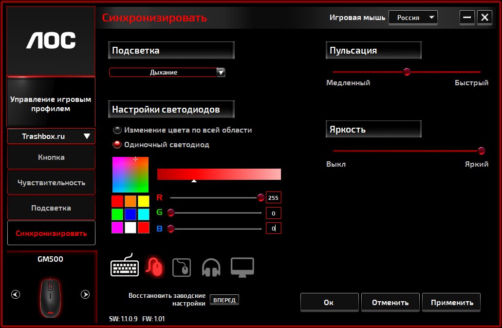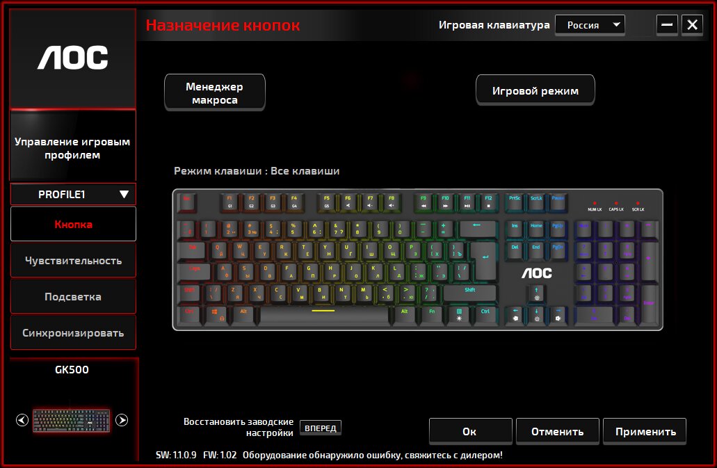 В комплект к клавиатуре AOC GK500 стоит присмотреться к мышке AOC GM500, которой посвящён отдельный обзор. Эта парочка очень гармонично смотрится вместе, а общая утилита и синхронизация подсветки добавляет удобства.