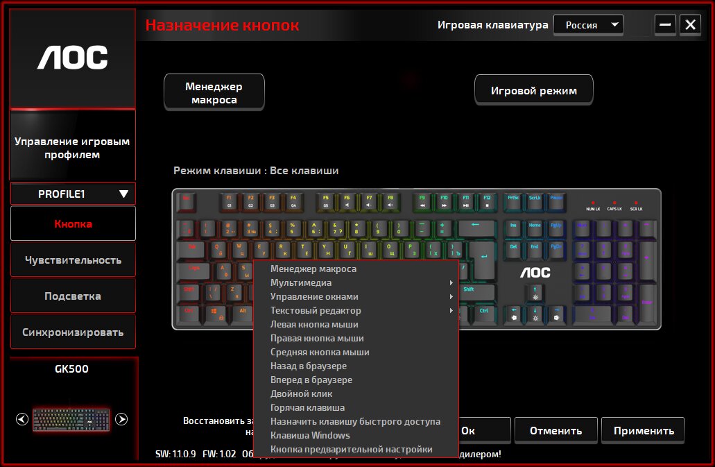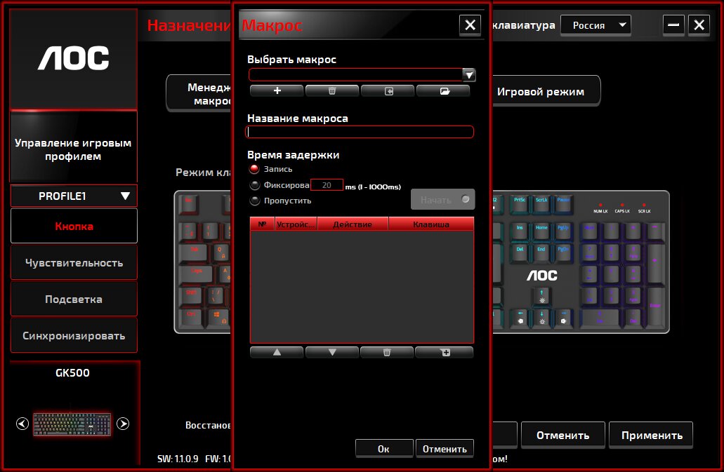 Действия клавиш переназначаются с помощью утилиты AOC G-Tools. Встроенный редактор макросов позволяет воспроизводить любые комбинации с настраиваемыми задержками между нажатиями.