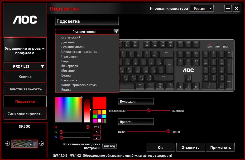 Кроме как горячими сочетаниями, подсветка настраивается через утилиту. В списке 12 эффектов, в том числе возможность настроить свечение индивидуально для каждой клавиши. Один из разделов программы посвящён синхронизации режимов свечения с другой периферией бренда.