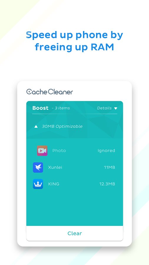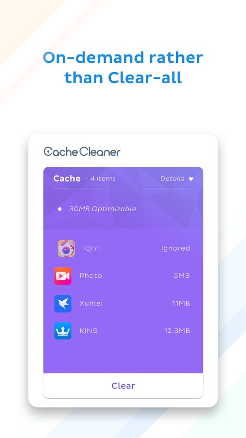 Cache Cleaner — быстрый инструмент для очистки кэш-файлов приложений. Один нажатие для того, чтобы очистить все файлы из кэша для получения большего доступного пространства.
