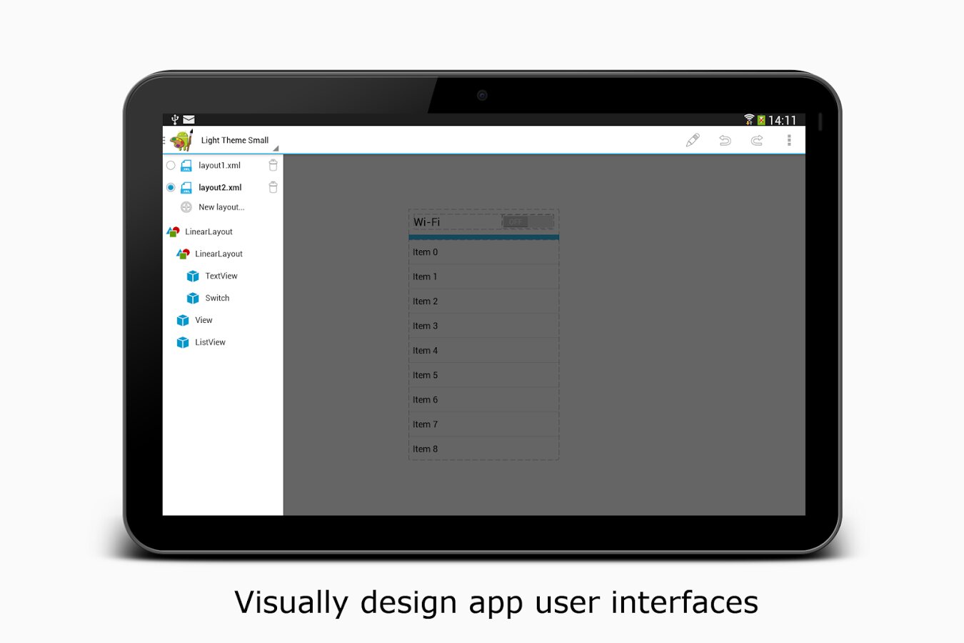 С этой программой вы можете легко создавать и редактировать интерфейс для своего приложения. Это приложение может работать автономно и поэтому полностью интегрирована в «памятной — Android IDE», если обе программы установлены. Она может импортировать и экспортировать XML файлы разметки Android, которые используют Android SDK для определения макетов пользовательского интерфейса.