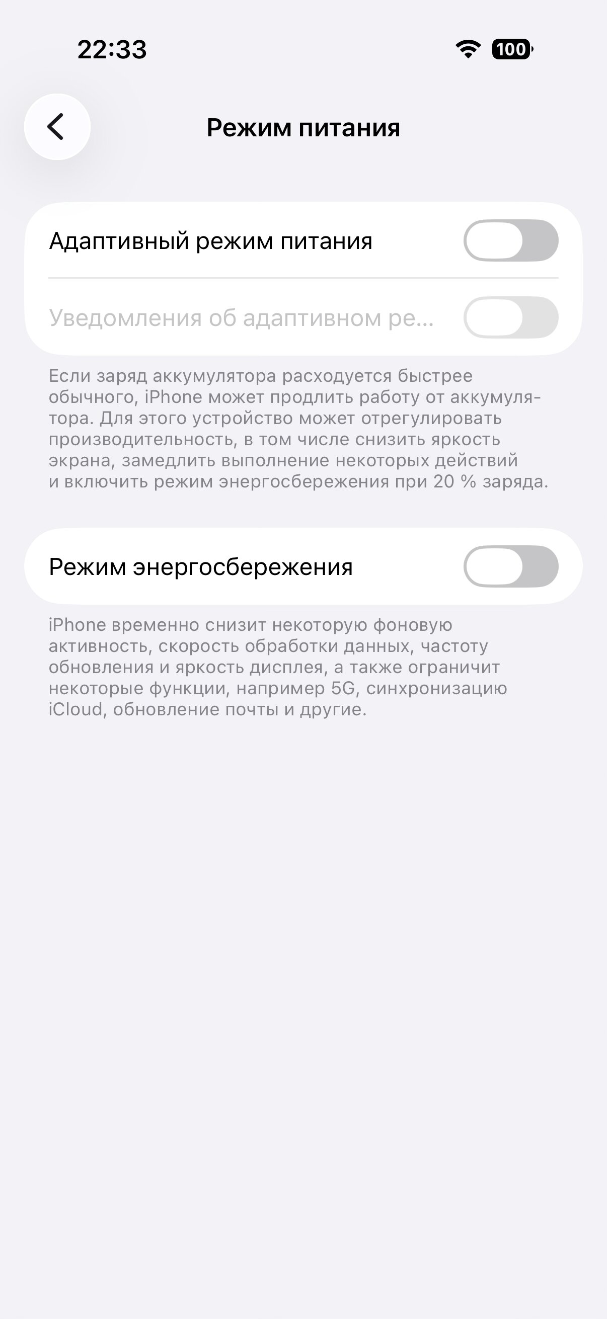 Что касается настроек, то в них нет ровно ничего интересного. Абсолютный минимум настроек, который не меняется уже много лет. Появилась лишь кнопка «Адаптивный режим питания», в котором смартфон сам решает, как быстро работать смартфону, что, якобы, должно продлить автономность, но в случае с новым 17 Pro искать дополнительную автономность как будто и не требуется.