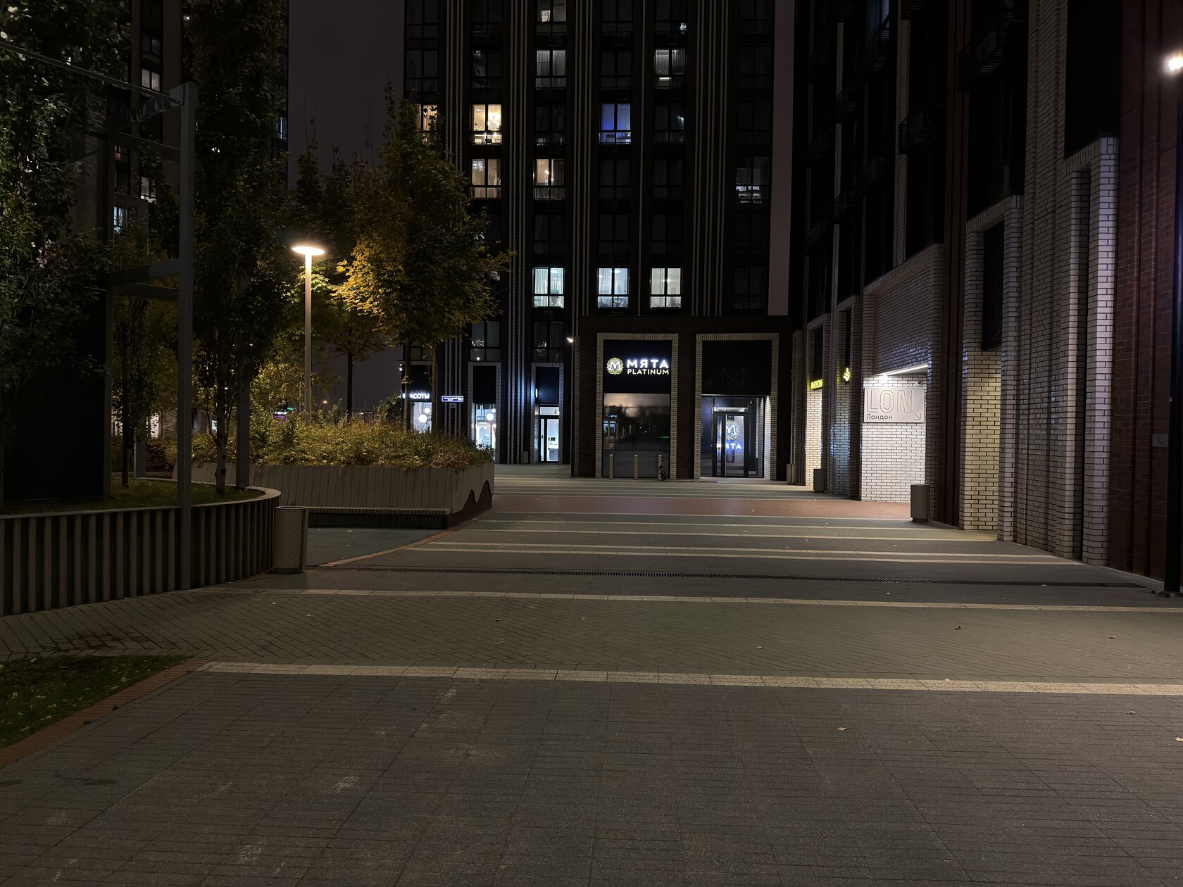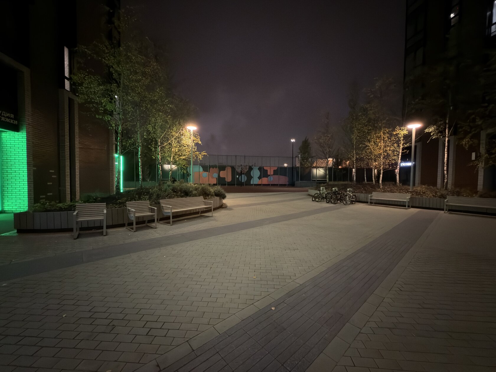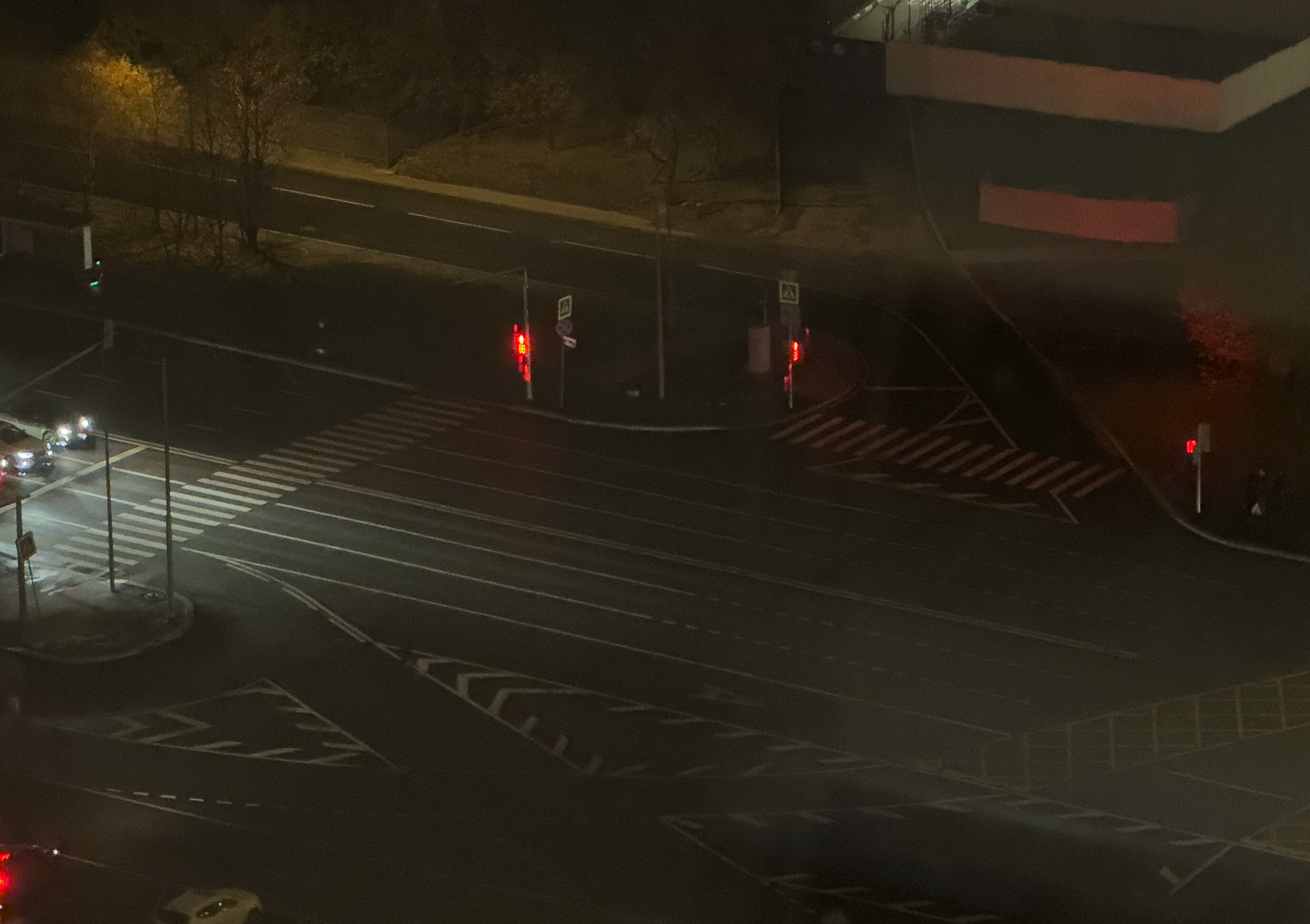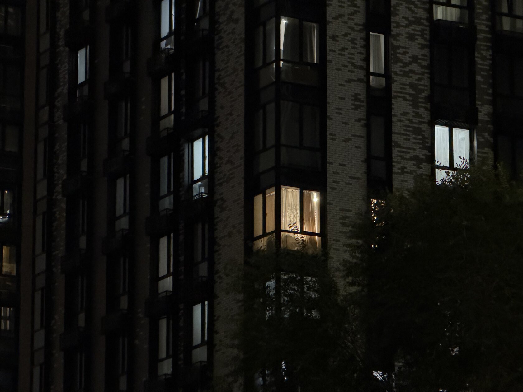 Есть еще один момент, который я поймал совершенно случайно. Новый телевик, который в этом году полностью обновился, очень плохо фокусируется, если фотографировать ночью через стекло. Я предполагаю, что камера видит небольшие блики на стекле и начинает теряться, потому что простое открытие окна исправляет ситуацию. Ниже будет два фото для примера.