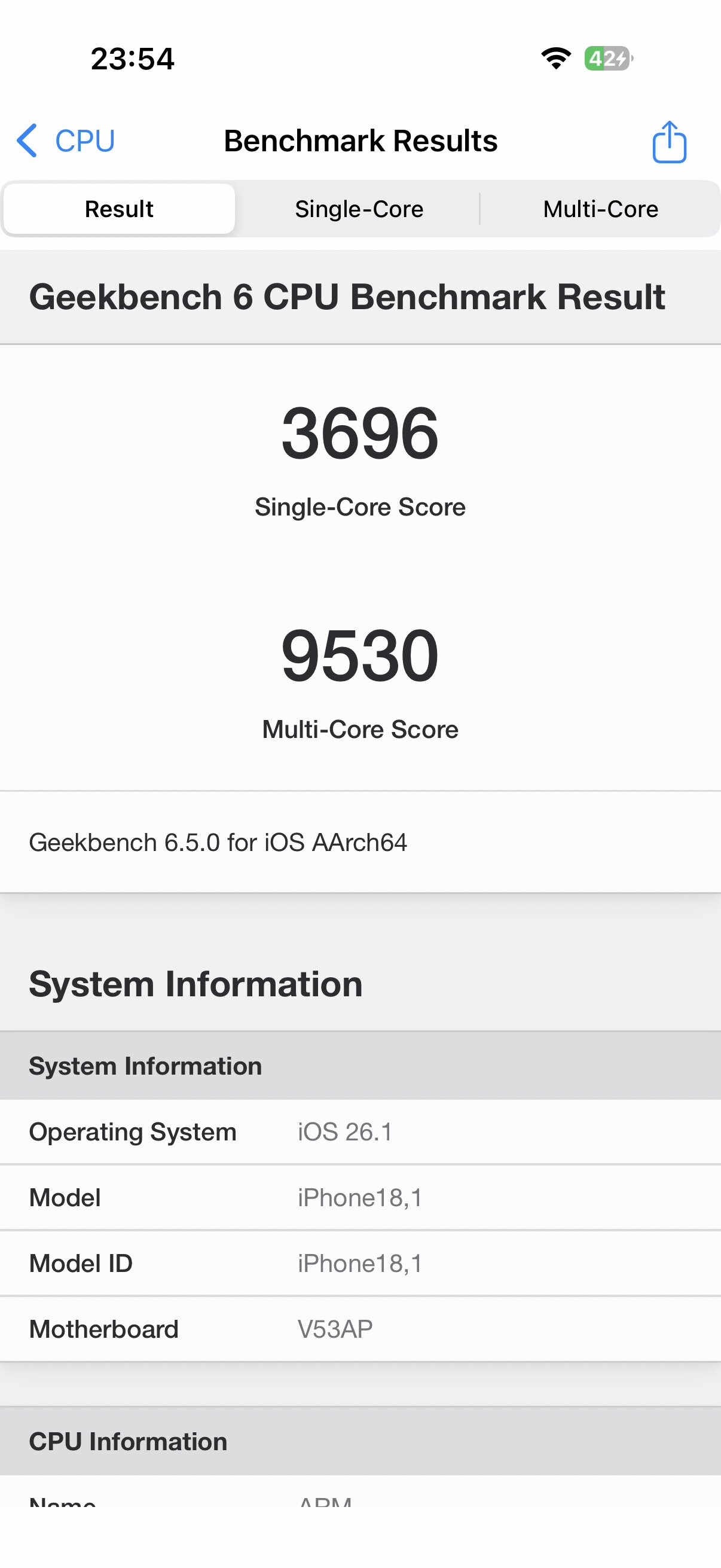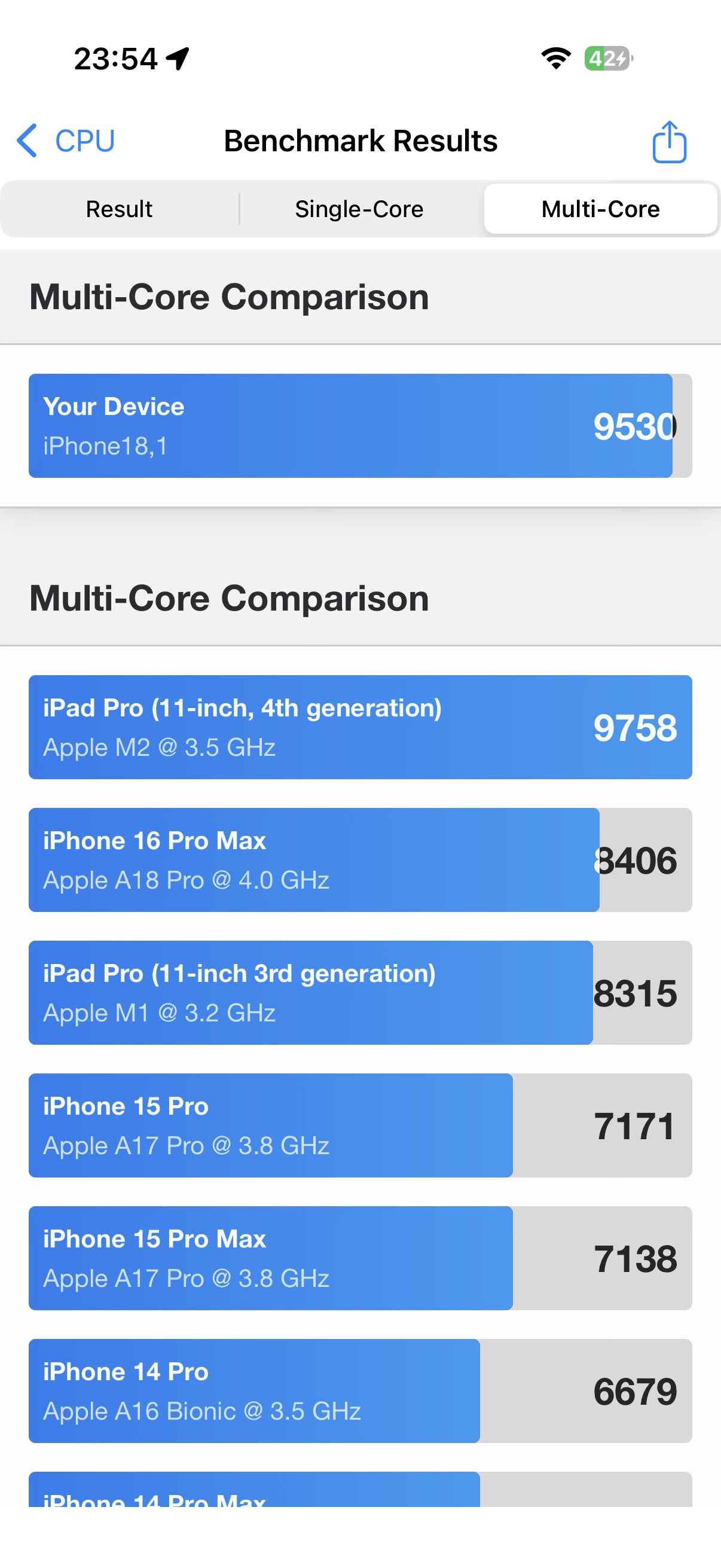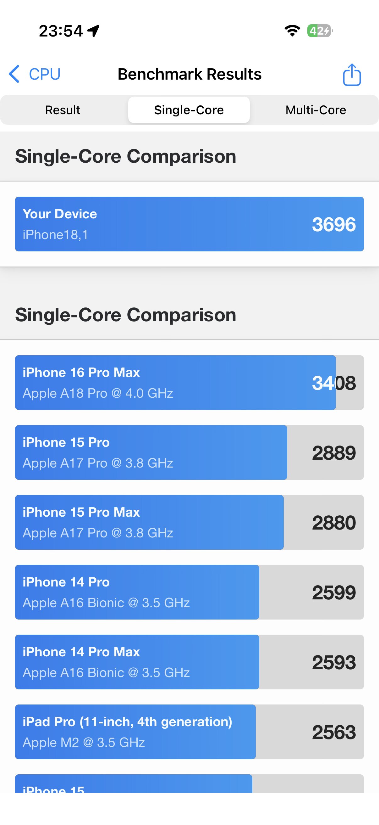 Голые цифры от Apple почти не дают никакой информации, так что давайте просто возьмем два смартфона: iPhone 16 Pro Max (A18 Pro) и iPhone 17 Pro с процессором A19 Pro и сравним данные из Antutu, так как это самый просто способ найти изменения в производительности. Итак, прошлогодний топ в лице iPhone 16 Pro Max выбивает 1 991 726 балов, а новинка 2 360 844, а значит мы получаем примерно 18% прироста. Но тут стоит отметить, что у версии Pro Max результат, судя по рейтинговой таблице на сайте AnTuTu, еще чуточку выше, правда, всего на 50 000 баллов. Это хороший отрыв, и он примерно соответствует заявлениям самой Apple. Ниже есть два скриншота, чтобы вы могли лично убедиться в цифрах.