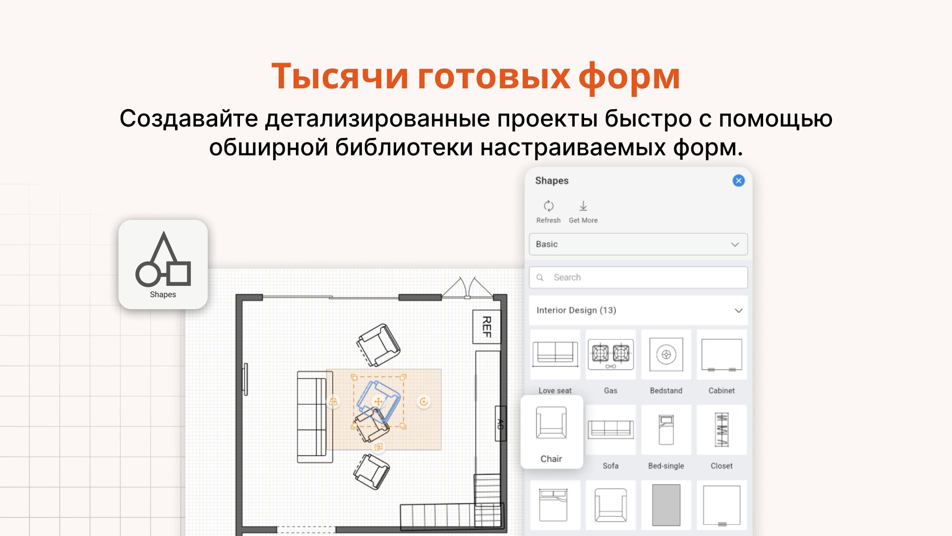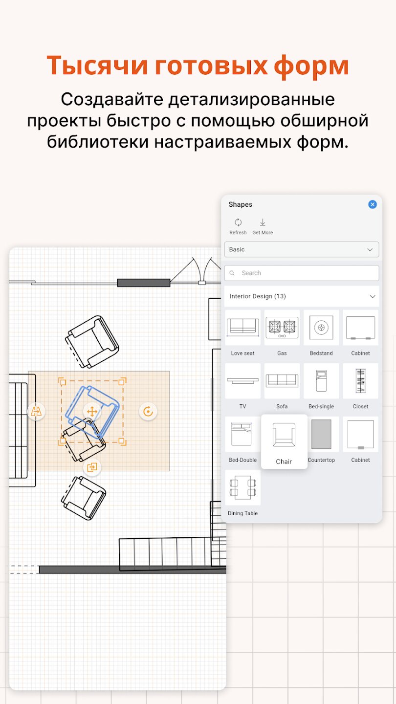 - Обширная библиотека из более чем 1500 готовых фигур с возможностью создания собственных.