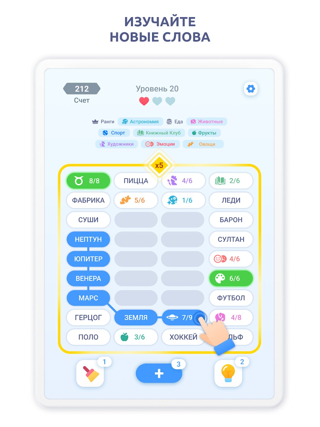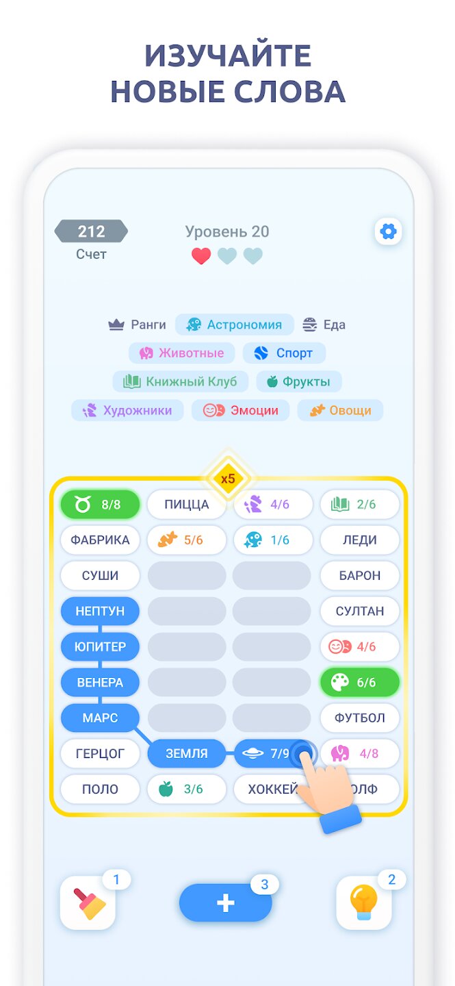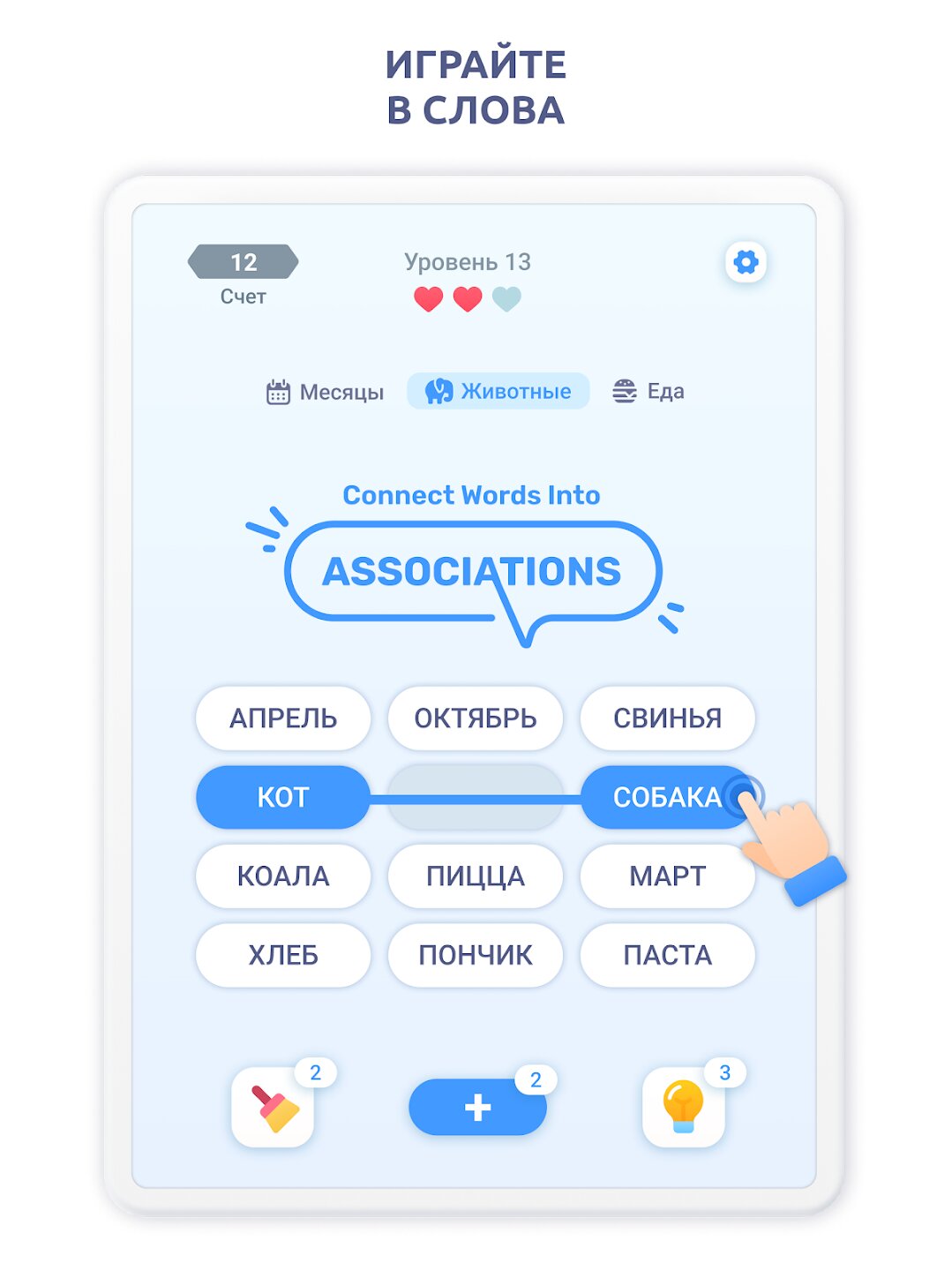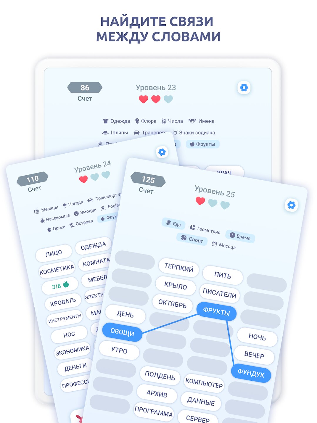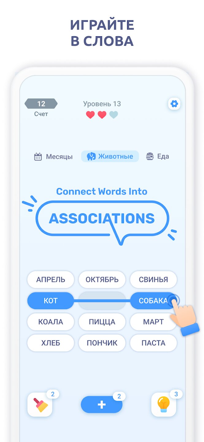 Ассоциации — Игра в слова! — это бесплатная увлекательная словесная головоломка, в которой вам предстоит находить и группировать слова по общим темам и логическим связям. Эта казуальная игра-головоломка сочетает в себе элементы поиска слов с глубоким стратегическим мышлением, предлагая расслабляющий, но в то же время стимулирующий ум опыт, которым можно наслаждаться где угодно — дома, на природе или в тихие минуты перед сном. Каждый уровень — это отличная возможность весело провести время и одновременно тренировать ум.