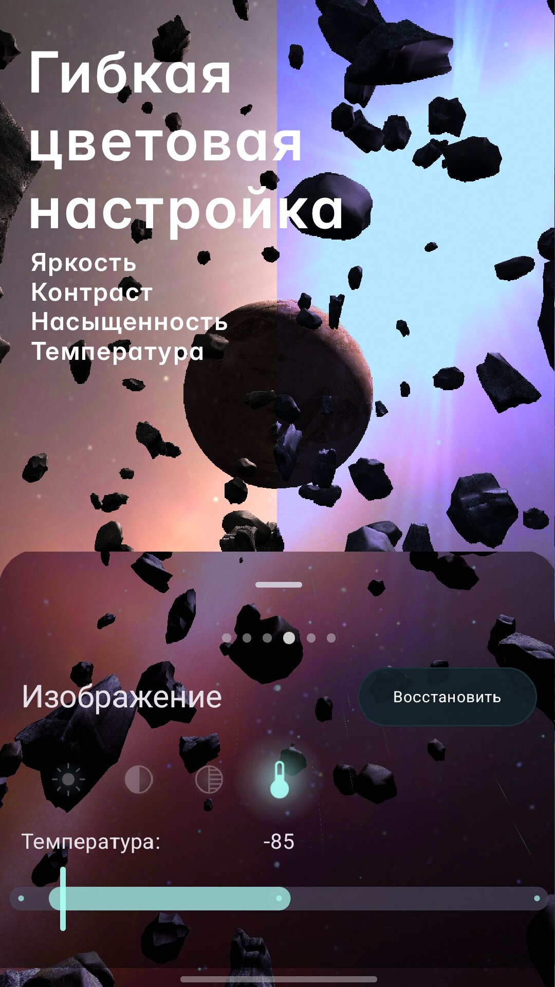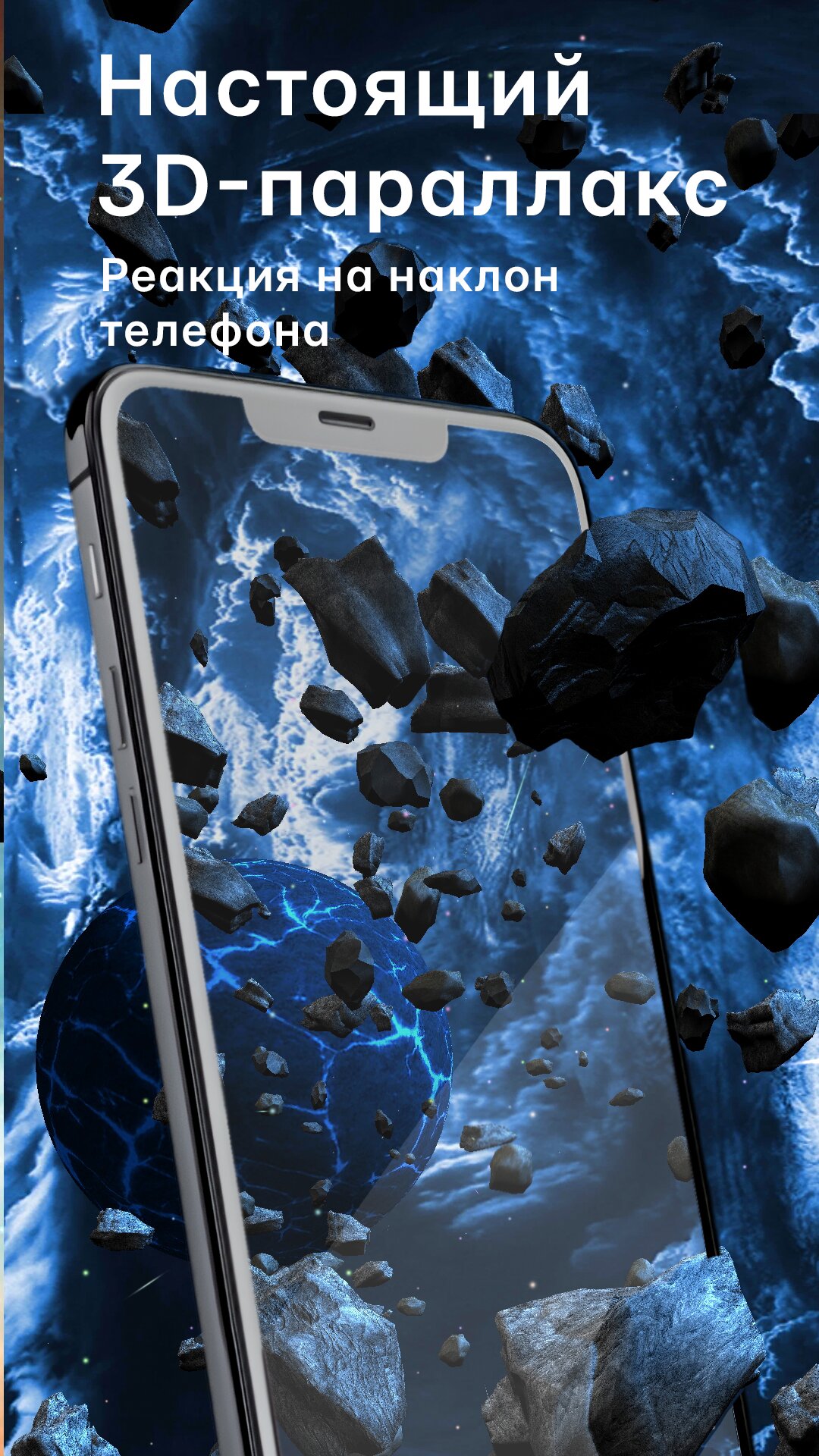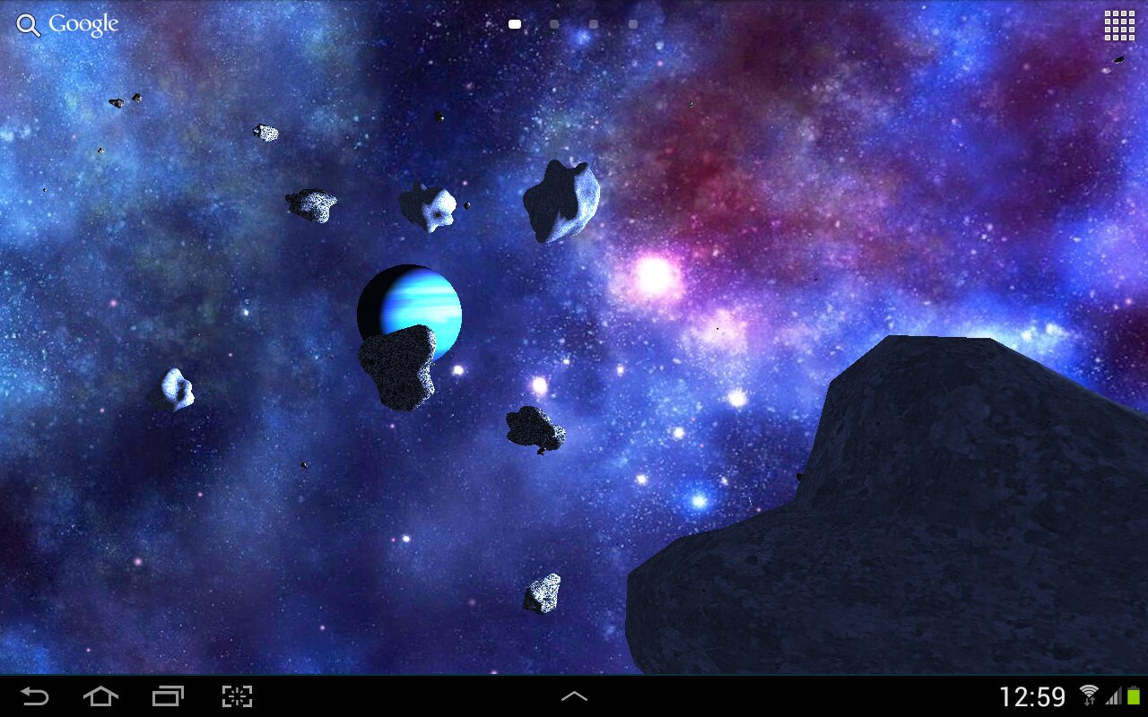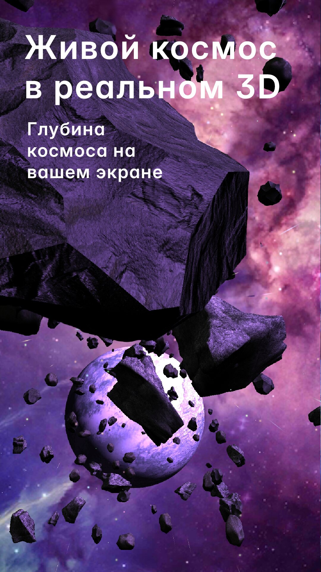 Asteroids 3D — это динамическая космическая сцена с настоящей глубиной пространства и плавным параллаксом при наклоне устройства.