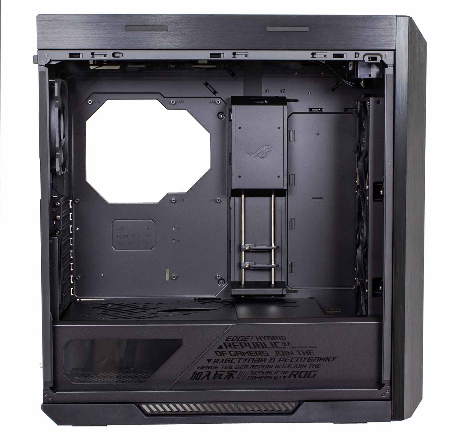 Strix Helios выполнен по «современной методике»: корзины под накопители за передней стенкой отсутствуют, блок питания размещен в нижней четверти. Под материнскую плату, видеокарту и их системы охлаждения отведено более ¾ объема, проблем с размещением габаритных комплектующих не будет.
