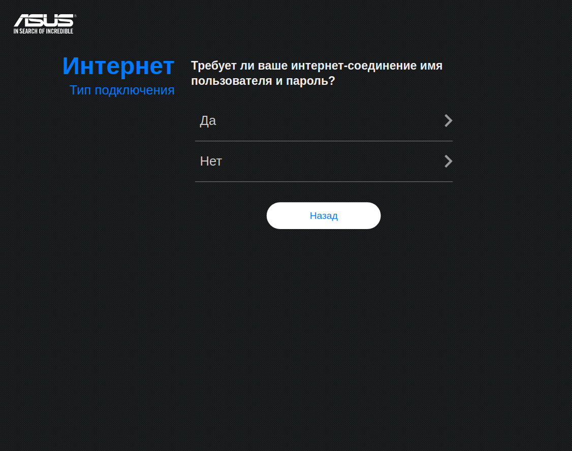 На данном этапе можно выбрать тип подключения к интернет провайдеру. Если выбрано туннельное соединение, то роутер попросит ввести адрес сервера, логин и пароль.