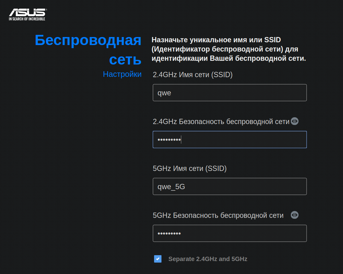 Настройка беспроводной сети сводится к вводу секретной фразы и задания названия сети. Сети можно разделить на две или же объединить в одну под одним названием.