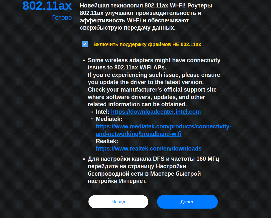 При первичной инициализации роутера он предупреждает пользователя о том, что некоторые беспроводные клиенты могут быть несовместимы с новым протоколом 802.11ax, и предлагает включить режим совместимости, а при возникновении проблем — обновить драйверы клиентов на сайтах производителей.