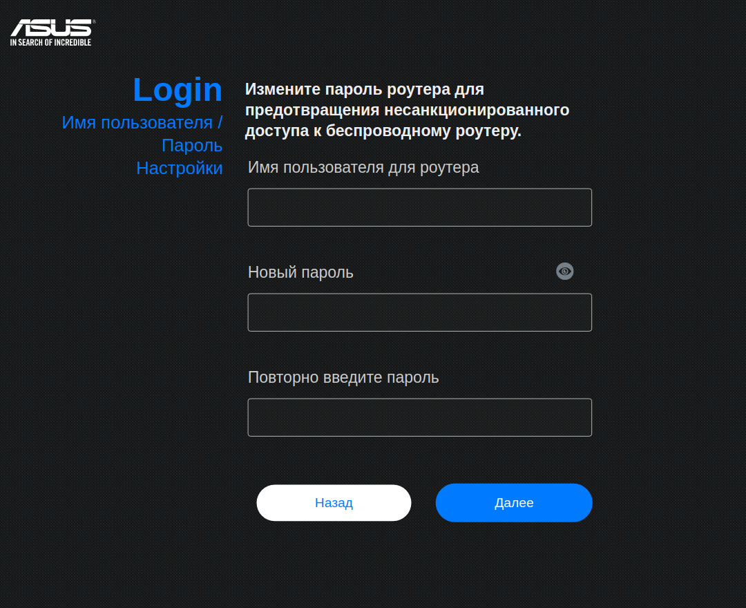 После установки и подключения по проводу к роутеру, пользователю остается зайти на router.asus.com и осуществить первичную настройку устройства. Тут есть два пути, быстрый — когда задается только имя сети и пароль, или медленный, когда необходимо выбрать еще несколько настроек.