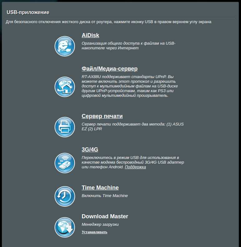 Наряду со стандартными сетевыми портами, маршрутизатор оборудован двумя портами USB 3.0 для подключения внешних устройств, таких как принтеры, накопители или 4G-модемы. При подключении устройства информация о нем выводится в главном меню интерфейса управления. Для подключаемых накопителей маршрутизатор обеспечивает работу пользователей внутренней сети с ними по протоколам SMB (CIFS) и FTP.