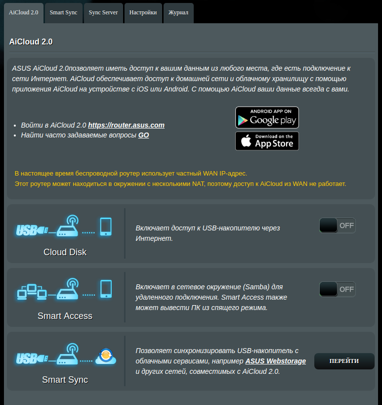 Присутствует и функция доступа к файлам и компьютерам внутренней сети — AiCloud 2.0. По сути, это набор из нескольких отдельных утилит: Cloud Disk, Smart Access и Smart Sync. При активировании функции AiCloud маршрутизатор становится этаким Master Browser для внутреннего сетевого окружения и начинает сохранять в себе список всех доступных сетевых устройств локальной сети маршрутизатора. При этом он поддерживает даже отправку пакетов magic packet на «спящие» сетевые устройства, на которых активирована функция пробуждения Wake On Lan (WOL).