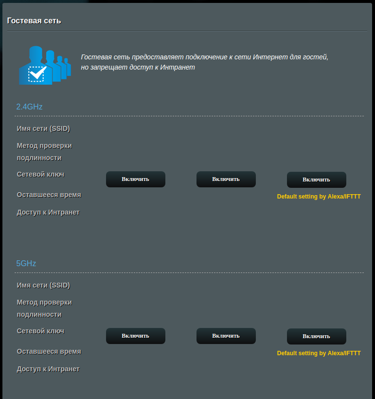 Помимо обычной настройки беспроводных сетей, имеется возможность создавать гостевые сети, изолированные от внутренней сети маршрутизатора