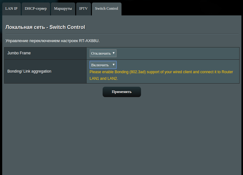 Стоит отметить, что агрегация портов согласно стандарту 802.3ad у ASUS RT-AX88U возможна на двух первых портах LAN, которые подключены к встроенному в SoC гигабитному коммутатору.