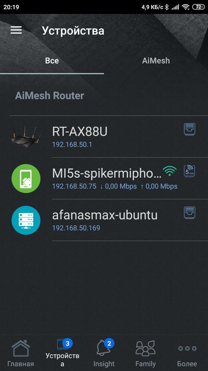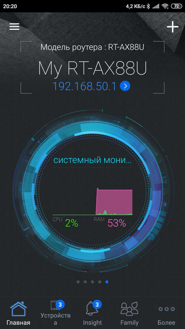 На главном экране приложения выводится подробная информация о подключенных устройствах, текущем трафике на роутере и загрузки процессора и памяти. Также там отображается список подключенных устройств и узлов AiMesh, если роутер работает в этом режиме.