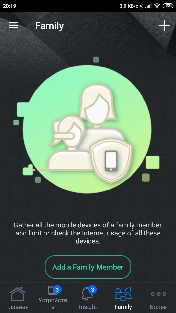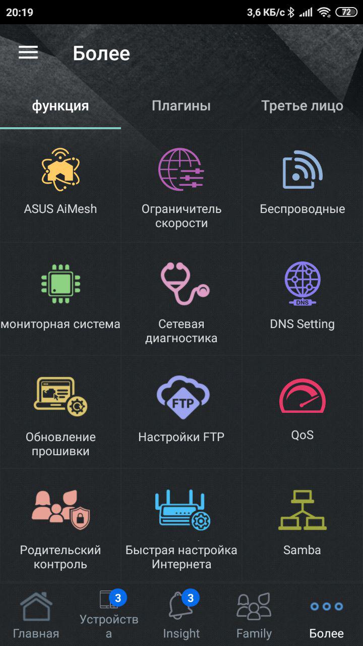 Для управления роутером через мобильные устройства компания ASUS предлагает свое фирменное приложение ASUS Router, которое дублирует функционал веб-панели управления в удобном формате и доступно в виде приложений для iOS и Android. В остальном прошивка этой модели мало чем отличается от других роутеров ASUS. Посмотрим ASUS Router поближе на примере версии для смартфонов под управлением Android.