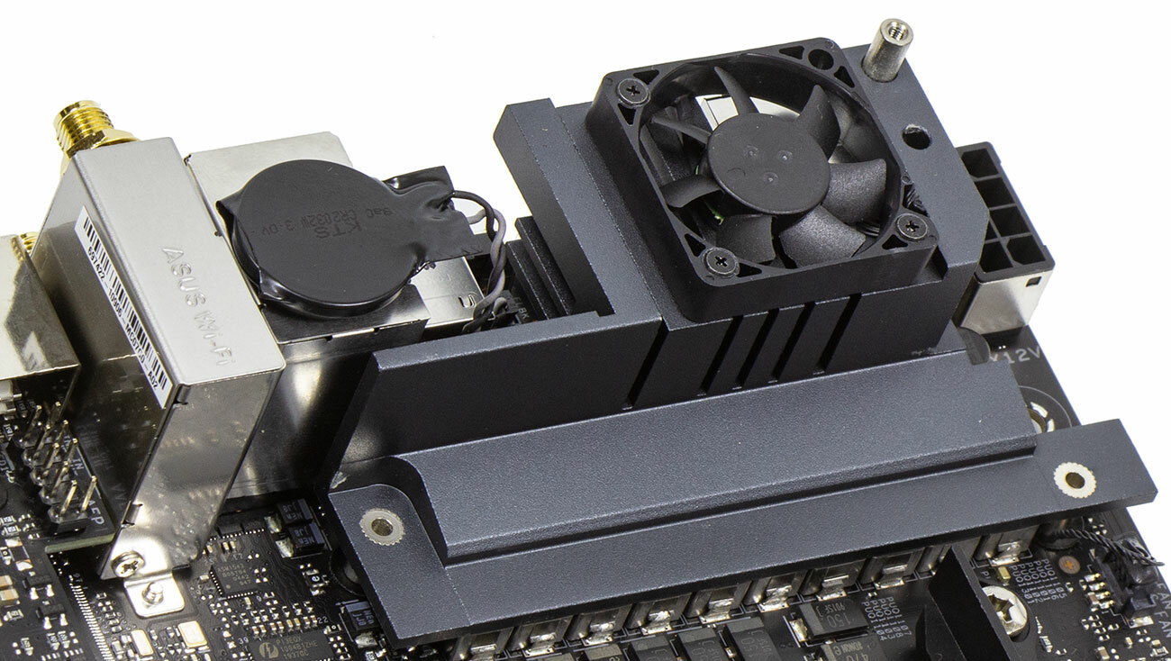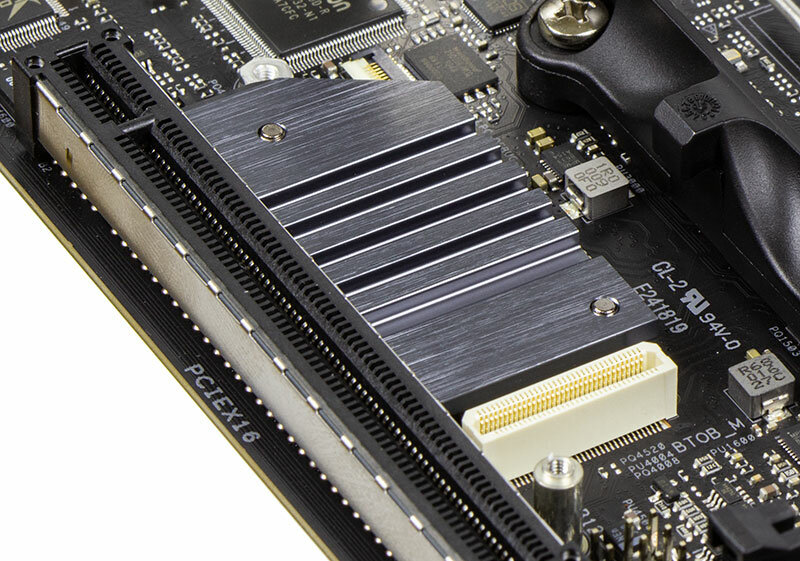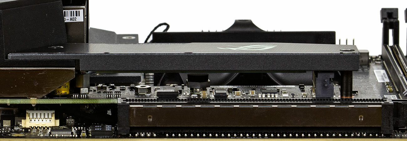 За ним хорошо виден радиатор для накопителя M.2 — крупную алюминиевую пластину сложной формы.