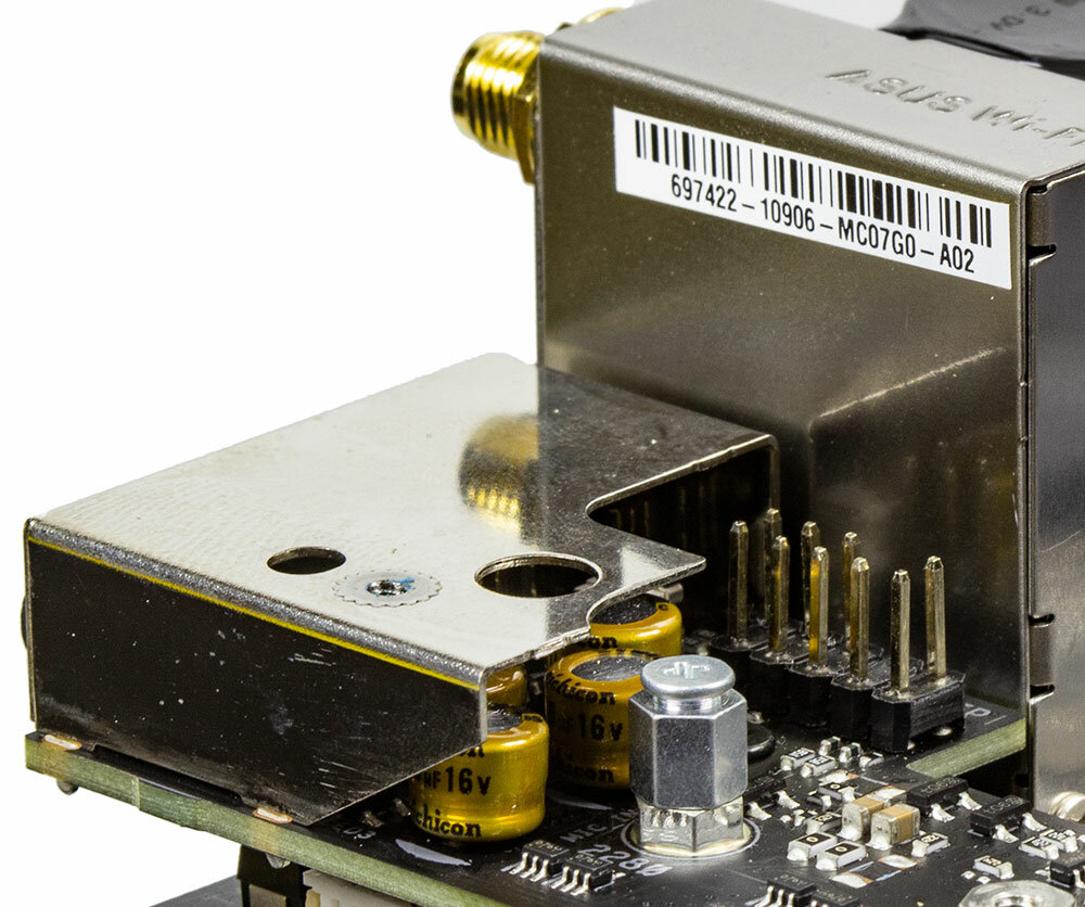 После радиатора на чипсете можно подумать, что инженеры ASUS решили не обращать внимание на качественное охлаждение. Но нет, с радиатором на системе питания все в порядке. Для начала стоит демонтировать кожух, нависающий над разъемами задней панели и по совместительству поддерживающий дочернюю плату с M.2-разъемом.