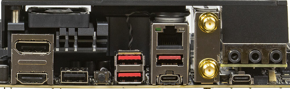 - Задняя панель: DisplayPort 1.4, HDMI 2.1, 3 × USB 3.2 Gen2 (Type-A), USB 3.2 Gen 2 (Type-C), 2 × USB 2.0, кнопка BIOS Flashback, RJ-45, 2 × SMA (2T2R), 3 × 3,5-мм аудиопорт, аудио USB Type-C.