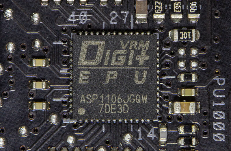 Преобразователем питания для процессора управляет контроллер ASP 1106GGQW, более известный как Richtek RT8877C. Фаз 10, или, если быть точнее, 8+2.