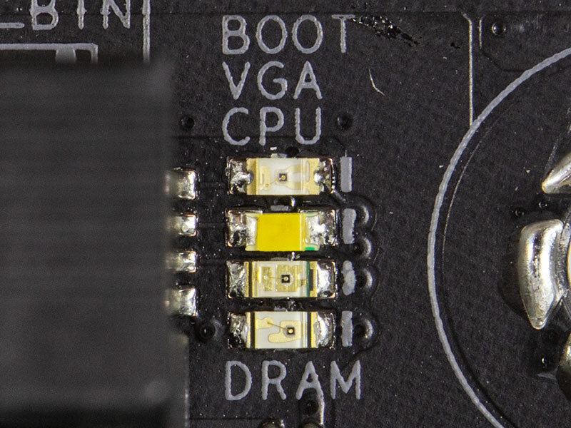 Поскольку чипсет B550 не предусматривает разгон процессора, то и полноценный индикатор POST-кодов решили не ставить, довольствуясь упрощенной его версией из четырех светодиодов, каждый из которых «отвечает» за отдельную стадию прохождения инициализации при старте.