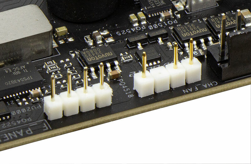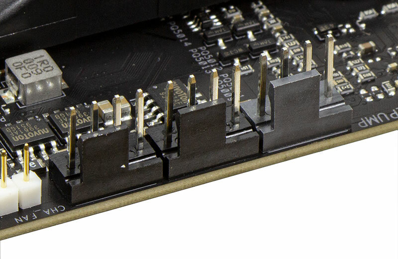 Разъемов под вентиляторы всего три, собраны они в группу. Причина проста: места в других уголках платы не так уж и много. Или, если оно есть, то тянуться туда для подключения вентилятора совершенно не удобно.