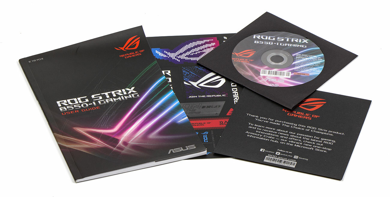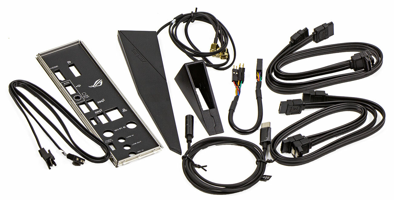 Вместе с материнской платой поставляется базовый набор аксессуаров: инструкция, диск с драйверами, пак наклеек, кабели SATA, заглушка задней панели, удлинитель для подключения ARGB-лент, антенна встроенного модуля Wi-Fi.
