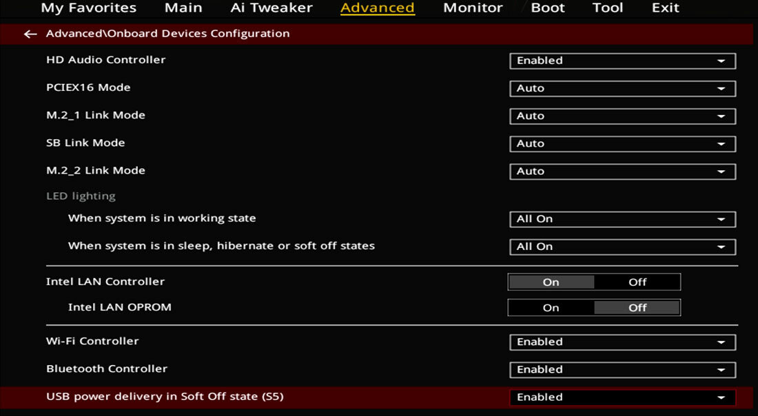 В разделе Advanced собрали все дополнительные опции встроенных контроллеров и режимов работы портов. Есть отдельная группа настроек для технологий центрального процессора.