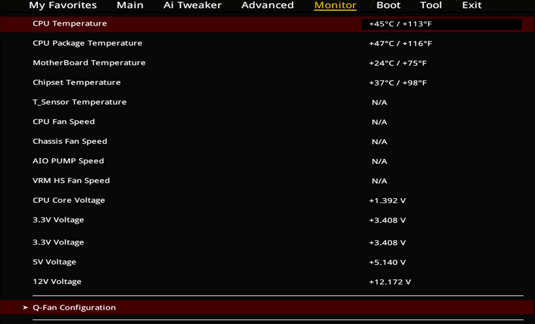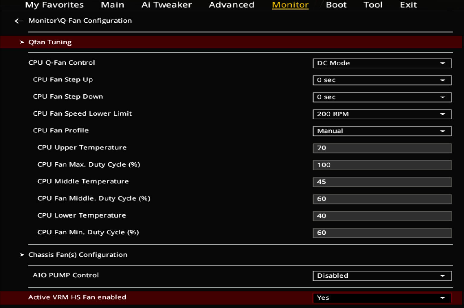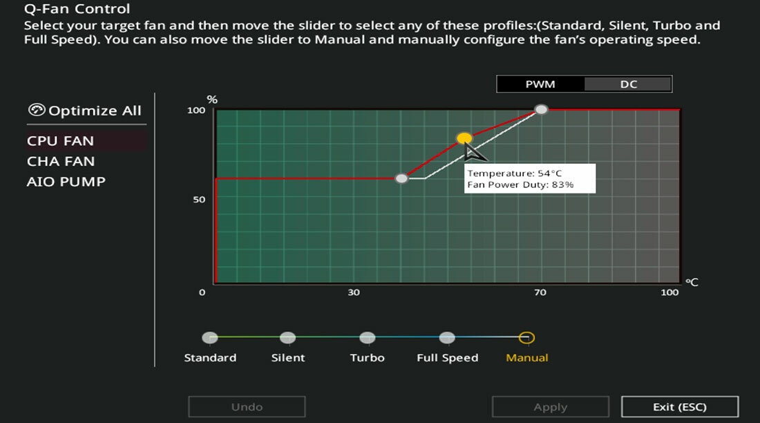 Название раздела Monitoring говорит само за себя: есть и напряжения, и температуры. Управлять оборотами вентиляторов можно через «утилиту» Q-Fan. Есть и готовые пресеты, есть и полностью ручной режим, где можно рисовать кривую изменения оборотов в зависимости от температур.