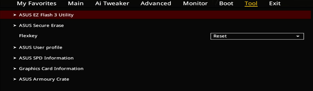 Полезные дополнения собраны в разделе Tool. Самым используемым у меня числится SPD Information, и EZ 3 Flash Utility часто пригождается. Также доступна информация о режиме работы слота PCI Express (с видеокартой), фирменная оболочка Armory Crate, удаление данных без возможности восстановления Secure Erase.