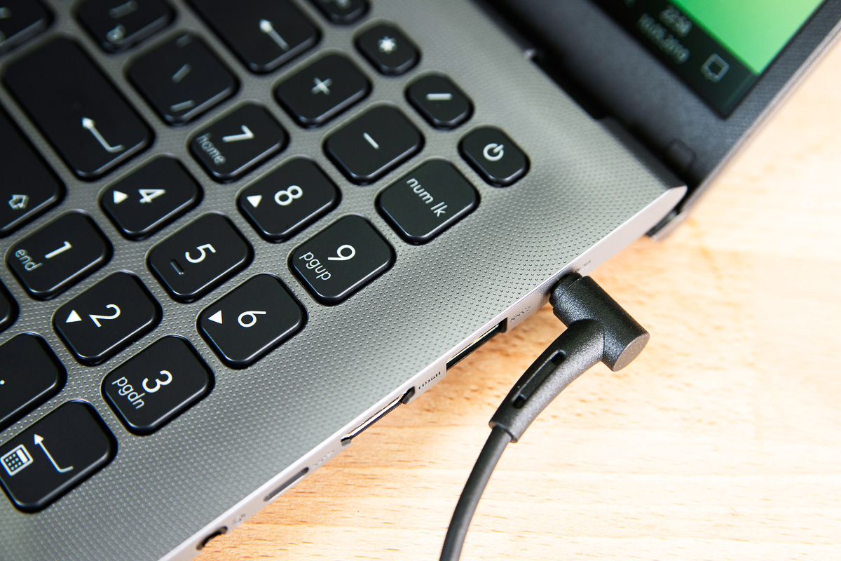Ёмкость несъёмного аккумулятора — скромные 37 Вт·ч. Рассчитывать на более, чем 2-3 часа работы в офисном режиме не приходится, под нагрузкой — не более 2 часов, поэтому лучше занимать места недалеко от розетки. Жаль от полезной утилиты Battery Health Charging, которая встречалась на VivoBook Pro N580VD, отказались. Другое нарекание — собственный круглый штекер, вместо современного USB Type-C с поддержкой Power Delivery.