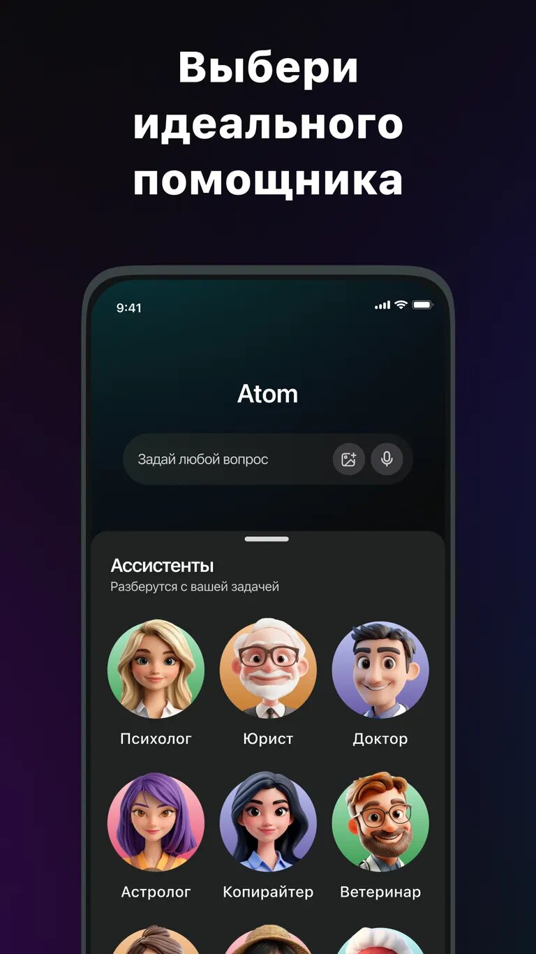 Atom позволяет общаться с экспертами, такими как копирайтер, врач, психолог, юрист, учитель и шеф-повар. Каждый персонаж обучен давать точные, контекстные ответы в своей области. Студенты могут получить помощь с домашними заданиями, объяснения и доступ к решению задач. Авторы могут создавать посты для блогов, рекламные тексты или контент для социальных сетей. Вопросы о здоровье можно задавать диетологу или ветеринару. Приложение использует модели GPT-4 и o1 для обеспечения релевантности и точности во всех разговорах.