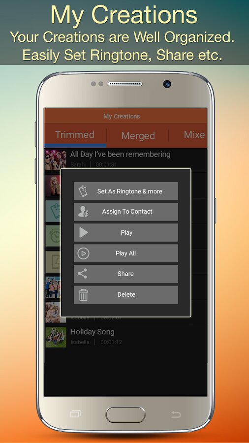 Приложение Audio MP3 Cutter содержит большое количество инструментов для редактирования аудио записей. Обрезайте записи или вырезайте нужные части песен, производите слияние мелодий, преобразуйте из одного формата в другой и прочее. Это поможет вам создавать уникальные рингтоны для сигнала вызова, будильника или уведомления.